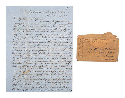 4 pages, 8 3/8 x 10 3/4 in., creased at folds, occasional stains. With stampless cover addressed to Edward D. Hicks, Nashville, TN.