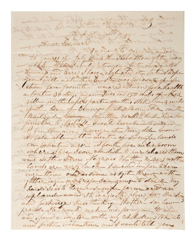 [With:] A letter from Jones Hicks to the same recipient, Edward D. Hicks. "Georgia Macon Cty," 10 October 1849. Among the updates he provides is the following: "A gentleman livinge [sic] at Ringolde [sic] owned A valuable settlemente [sic] of swampe [sic] lands on Flinte [sic] river About five miles from whare I live I concluded to purchase them and settle sum Negroes on the river as the lands are very rich..."