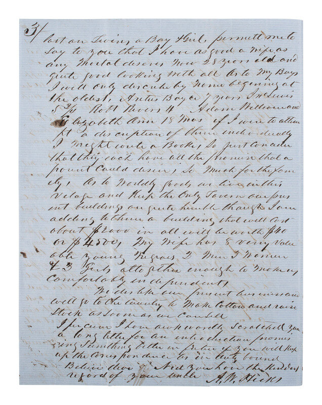 He then explains how he married again in 1844, had 5 children, and opened the only tavern in their town. Of his wife, he writes: "My wife has 8 very valuable young negroes 2 men 3 women & 3 girls altogether enough to make us comfortably independent. We dislike our present business and will go to the country to make cotton and raise stock as soon as we can sell."