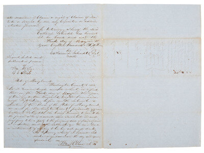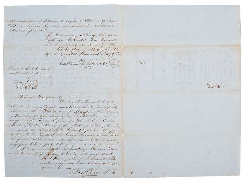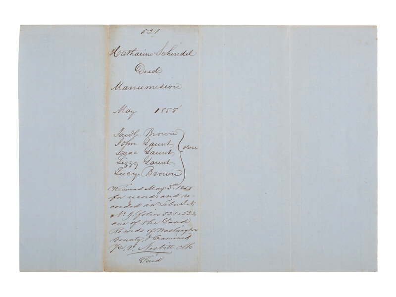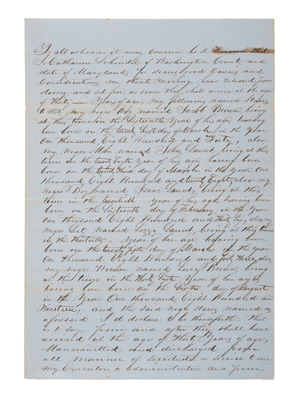 Deed outlines the manumission of Jacob Brown, a 16-year-old male, born on 26 March 1840; John Gaunt, a 28-year-old male born on 223 March 1828; Isaac Gaunt, a 20-year-old male born on 16 February 1836; Lizzy Gaunt, a 13-year-old female born 25 March 1843; and Lucy Brown, a 36-year-old female born on 6 August 1819. Catharine Schindel of Washington County, Maryland declares the named enslaved persons to be "manumitted and discharged from all manner of servitude or service" once they turn 30 years old. Schindel places her mark at the end of the document, which is countersigned by a justice of the peace and one other person.