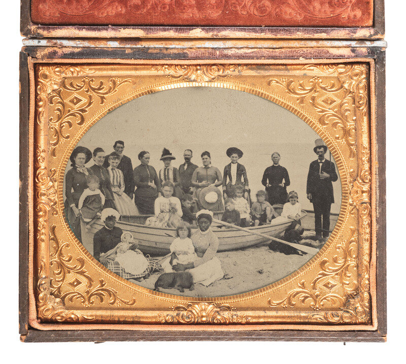 Adults and children of various ages and dispositions pose in and around a studio prop row boat. The two African American subjects sit on the ground, which appears to be covered with sand, each holding a child in her lap. Two dogs are also featured in the portrait, lying in the sand at either end of the boat.