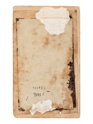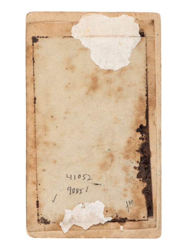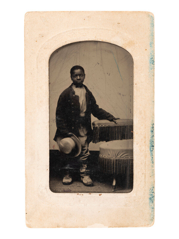 3 1/4 x 2 in. tintype displayed under 4 x 2 3/8 in. paper mount, featuring a studio portrait of a young male subject with hat in hand, wearing what appears to be an oversized military jacket and boots, possibly a contraband (some light bends/creases in plate, small nick near lower left corner, toning/soiling to mount, residue on mount verso).