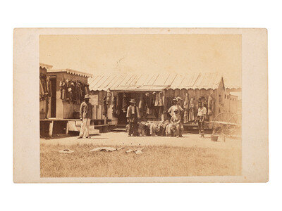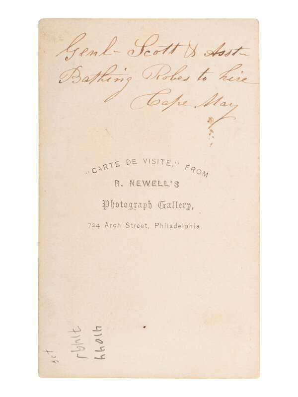 CDV on cardstock mount (some toning particularly to right side of image, minor residue to print; mount with light soiling and wear to edges/corners). Verso bears Newell's gallery imprint and period ink inscription reading, "Genl. Scott & Asst- Bathing Robes to hire / Cape May."