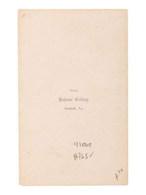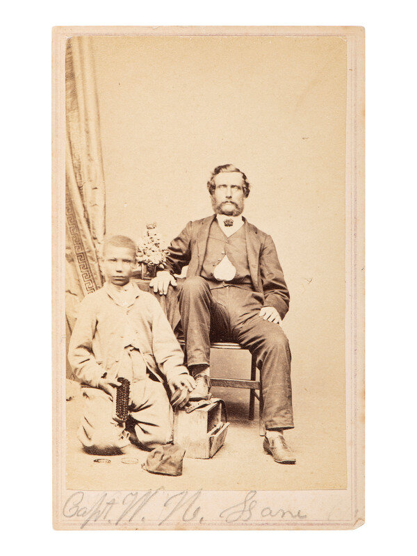CDV on cardstock mount with handwritten caption in lower margin, "Capt. W. N. Lane." A studio view of a Caucasian man seated in a chair with one foot positioned on a foot rest. A young African American male subject kneels beside him with brushes in hand, shining his shoe. Norfolk, VA: Holmes' Gallery (toning; light edge and corner wear to mount).