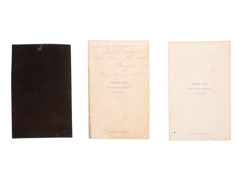 3 photographs, including the following: 2 CDVs on cardstock mounts, each with credit on verso to Hubbard & Mix, Beaufort, SC (toning, light soiling, mild edge wear). The first shows instructor Fannie Langford teaching formerly enslaved children how to read and write at the first school for the formerly enslaved in South Carolina, the Hooper School on the Old Fort Plantation in Beaufort, SC, Port Royal Island. The second carte is signed on verso, “Fannie Langford, Hooper School, Old Fort Plantation, Beaufort, SC Port Royal Island.” Written on bottom recto “My favorite pupil Uncle Smart Washington 71 yrs.” -- Anonymous tintype believed to show Fannie Langford, 3 3/4 x 2 1/2 in. (some surface mottling, discoloration near bottom edge of plate).