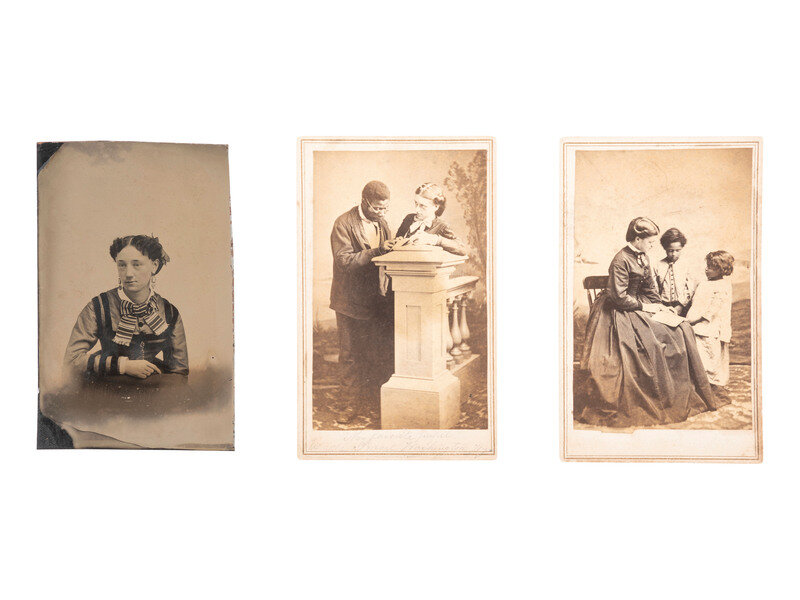 [AFRICAN AMERICANA - EDUCATION]. A group of 3 photographs, incl. tintype and CDVs of teacher Fannie Langford and formerly enslaved students at The Hooper School on the Old Fort Plantation, Beaufort, SC.
