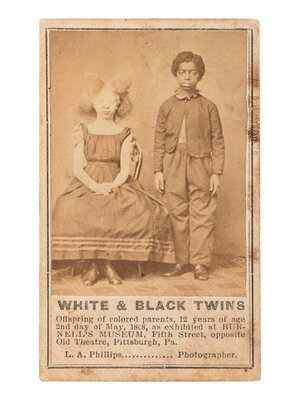 CDV on cardstock mount (toning, some soiling to print and mount, edge wear to mount). Additional information printed in lower margin of mount: "Offspring of colored parents. 12 years of age 2d day of May, 1868, as exhibited at Burnell’s Museum, Fifth Street, opposite Old Theatre, Pittsburgh, Pa." With credit to "L.A. Phillips, Photographer" printed in lower margin. A studio portrait of identified twins, Helen Ann Windman Walker and Henry Sedam Walker.