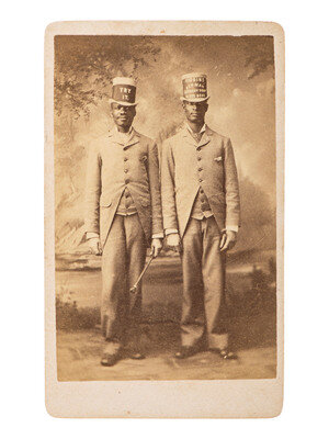 [AFRICAN AMERICANA - EARLY PHOTOGRAPHY]. Occupational CDV featuring two African American men advertising Higgins Berman Laundry Soap. Brooklyn, NY: B. Block.