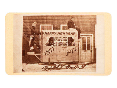 CDV on cardstock mount providing outdoor view of a carriage with "Happy New Year / 1877" painted on the side in addition to the names "Chas. Clark, E.F. Beaupre, J.R. Coulter, and J.M. Conway." A Caucasian coachman is seated at the front with reins in hand, while a young African American male subject, possibly a footman, stands at the back of the carriage. Uncredited (toning, overall very good condition).