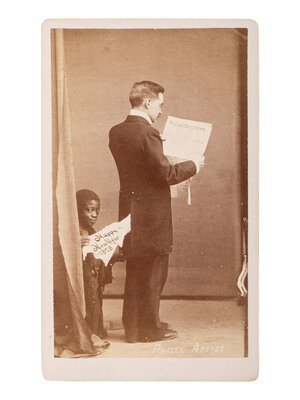 CDV on cardstock mount (very good, light toning). A curious view of a Caucasian man standing, closely reading a newspaper, while a young African American male subject with a playful expression kneels behind him, holding a sign inscribed, "Happy New Year, 1878."