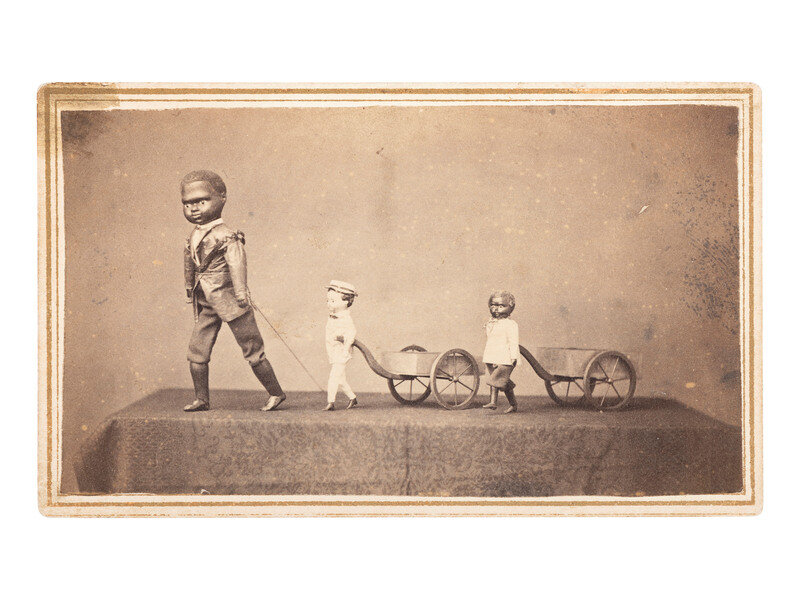 CDV of a combination of Black and white toy dolls, two of which pull wagons, displayed on a tabletop. Uncredited (soiling to top left corner, light edge wear). A curious carte de visite.