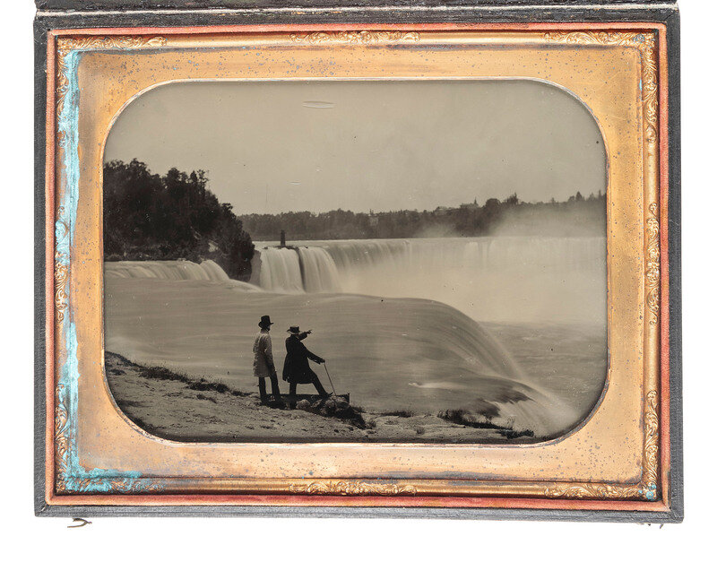[EARLY PHOTOGRAPHY]. [BABBIT, Platt D. (1823-1879), attributed]. Whole plate ambrotype featuring two men surveying Niagara Falls from Prospect Point. Ca 1850s.