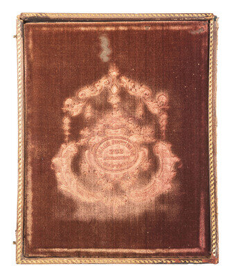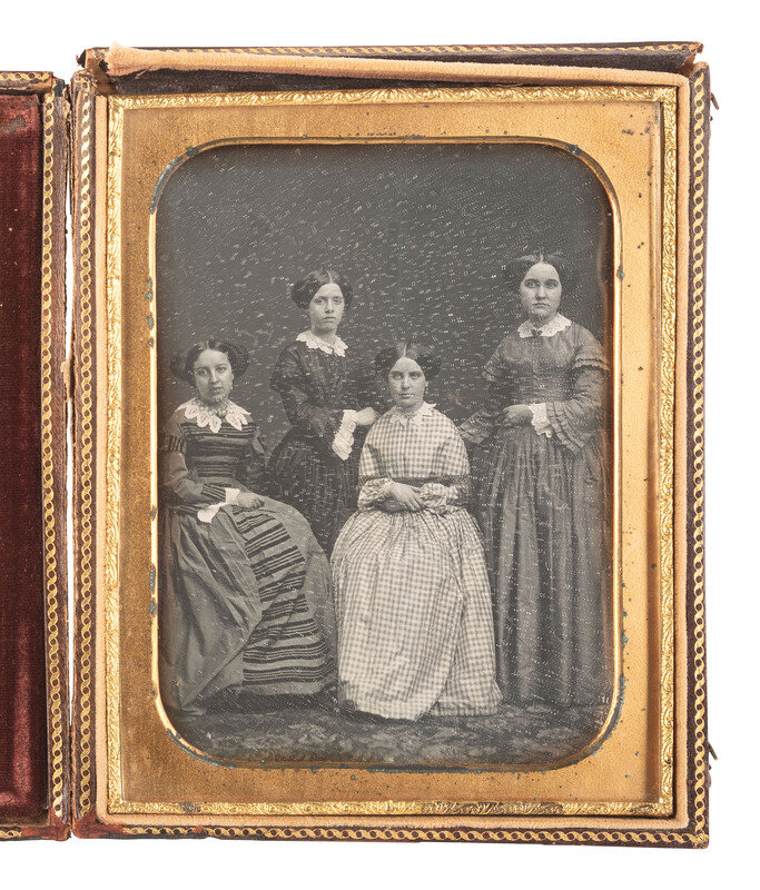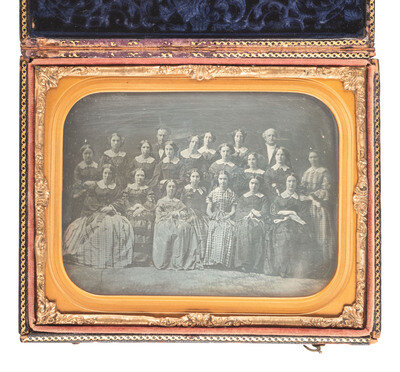 Fascinating portrait of a large group including 18 females and 2 males, likely students and their teachers. (Surface scratching, spotting, light discoloration in areas; reglazed and resealed 2001.) Housed in a pressed paper case (some separation to upper edges, misalignment, surface wear). -- Striking portrait of 4 women seated and standing together, likely family members. (Light tarnishing to edges, debris between glass and plate, spotting to plate and mat; resealed.) Housed in a fully separated pressed paper case (top edge of case base nearly fully separated, velvet wear and loss to pad). Velvet pad stamped for Meade Brothers, 233 Broadway, New York, NY. -- Together, 2 half plate daguerreotype portraits of groups of women.