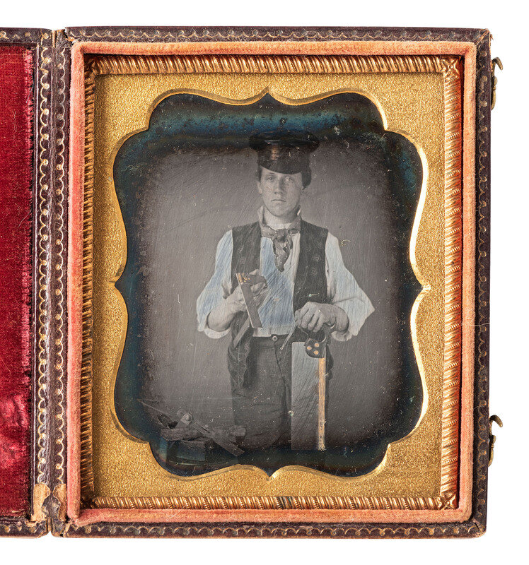 Sixth plate daguerreotype portrait of a carpenter wearing a hat and vest, standing and holding a saw in one hand and a carpenter's square in the other. Additional tools are visible atop a nearby table. (Significant tarnishing to edges, vertical wiping throughout; unsealed.) Housed in a pressed paper case.