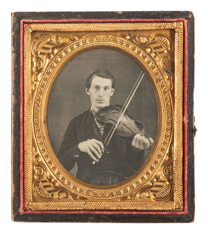 Sixth plat e daguerreotype portrait of a young man holding his violin and bow as if ready to play. He stares directly into the camera. (Minor spotting, notable scratch to left portion, some scratching to bottom edge; reglazed and resealed 2022.) Housed in a half pressed paper case.