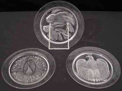 Comprising 1965, 1966, 1967, 1968, 1969, 1970, 1971, 1972, 1973, 1974,1975 and 1976, each with molded clear and frosted decoration; together with a Daum Nancy 'Nymphea' plate, dated 1979. (13).
