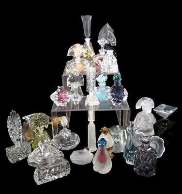 Twenty-eight assorted glass fragrance bottles together with a Lalique stopper