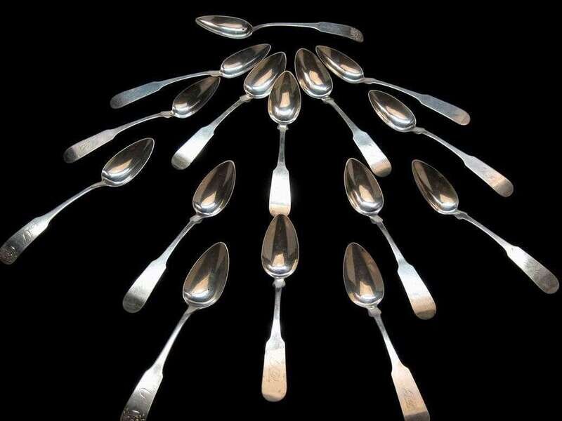 Set of twelve American silver grapefruit spoons together with three tea spoons