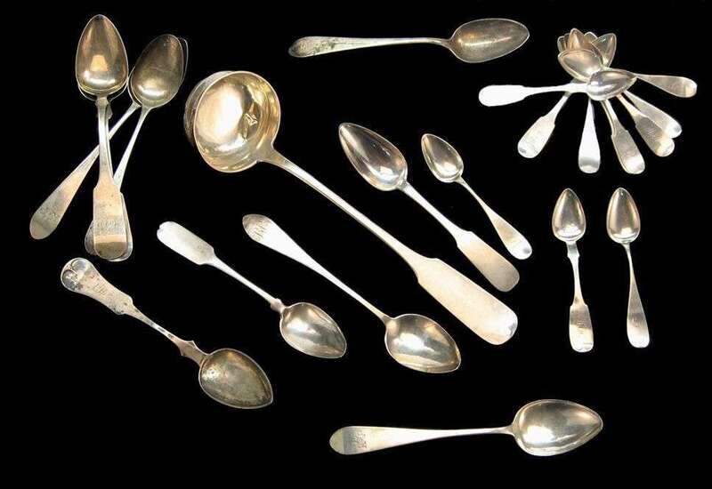 Twenty-two piece collection of American silver table and tea spoons and a ladle 18th/19th century