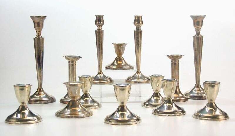 Seven pair of weighted base sterling silver candlesticks