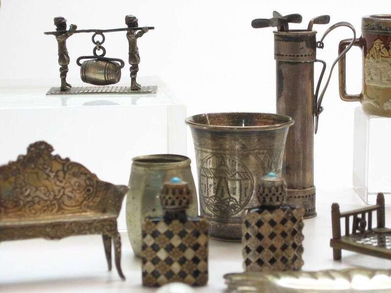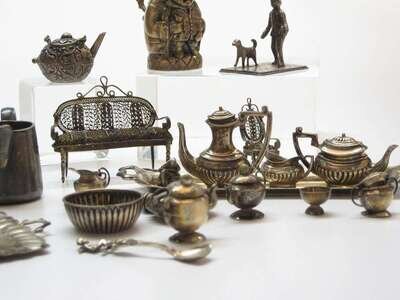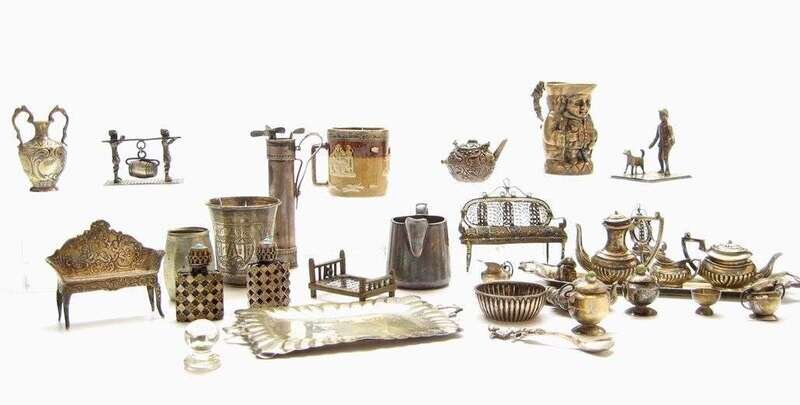 Five piece miniature English sterling silver tea and coffee set, Russian silver vodka cup and various miniatures birmingham, 20th century, cup stamped '84'