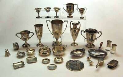 Eighteen piece assorted sterling silver holloware together with eight piece silverplate holloware