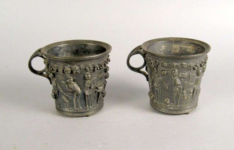 Pair of pewter beakers with skeleton figural relief decoration possibly originates from the balkans