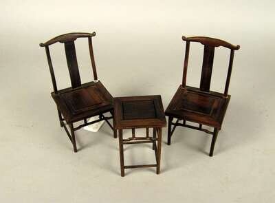 Miniature Chinese 'yoke back' three piece hardwood suite