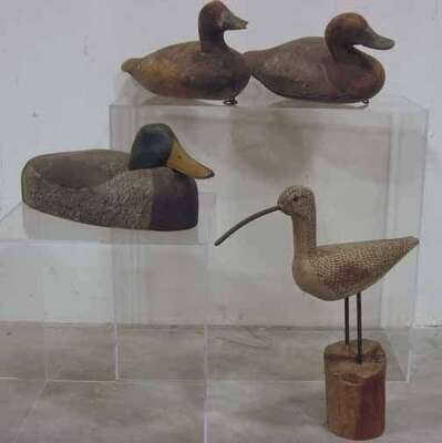 Group of four carved and painted shore bird decoys one with weight marked e.l.b., 20th century