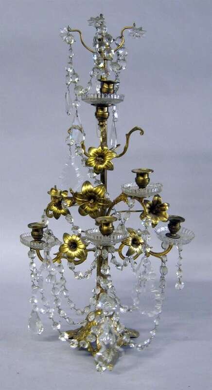 Pair of French gilt metal and glass luster six-arm girandoles together with a smaller girandole early 20th century