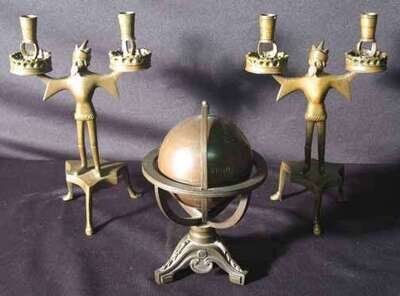 Pair bronze figural candelabra and terrestrial globe 20th century