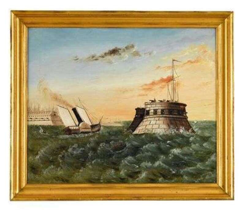 SCHOOL OF THOMAS CHAMBERS - HARBOR SCENE WITH FORTRESS AND STEAM BOAT (AMERICAN 1808-1866)
