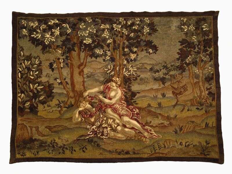 Continental needlepoint and petitpoint panel 'amarillis crowning mirtillo with a floral wreath', 19th century