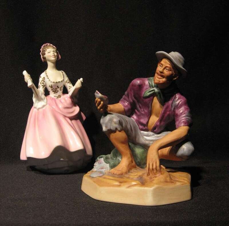 Two piece Royal Doulton figures of a man and woman Named " The Beachcomber " and " The Ballad Seller ".