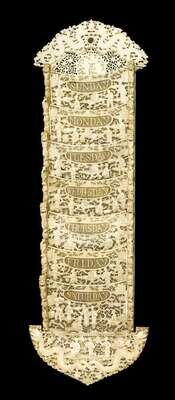 Of tall rectangular form, double dragon carved crest over seven 'day' sleeves all carved in high detail to show figural landscape, terminating in arrow form crest.