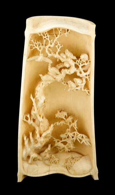 Of tapering, bamboo form; deftly-carved interior depicts natural scene of birds in weathered tree above bamboo stalks; exterior carved with single leafy stalk of bamboo.