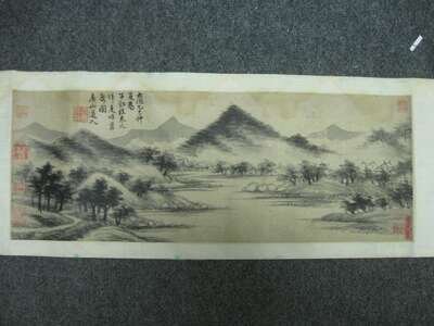 Three panel handscroll, wash and ink on paper, Sung style, hanging scroll, Landscape image L: 24 in