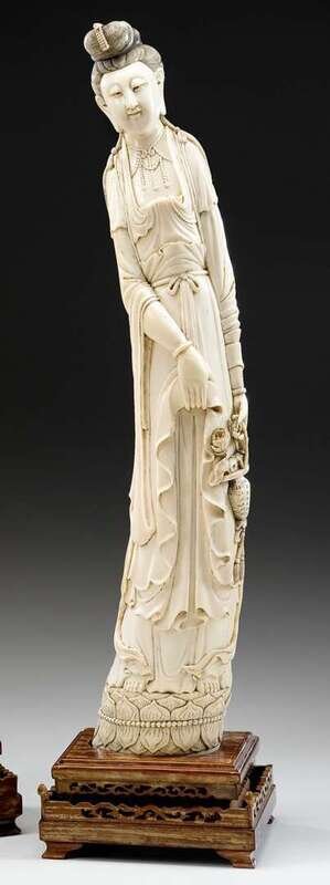 Single section, convex figure carved to show standing female form, grasping basket over double lotus throne, wood stand.