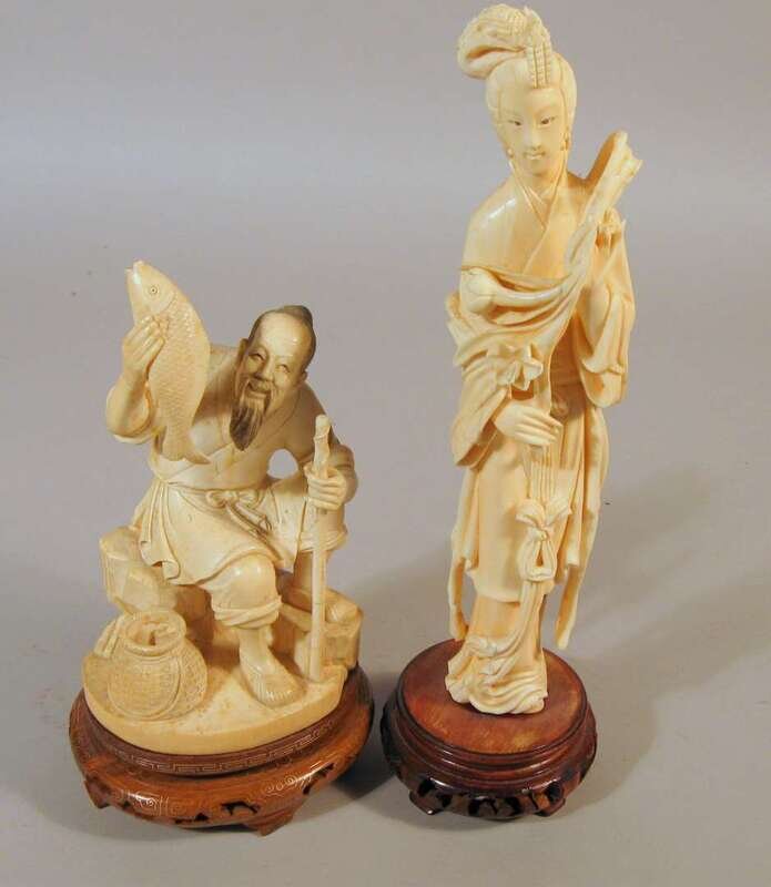One of tall single section, worked to show a meiren, together with a well carved model of a fisherman, wood stands.