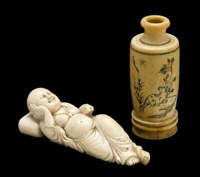 The vase of baluster form, incised ink work to show foliate sprigs and birds in flight, together with a Budai table study.