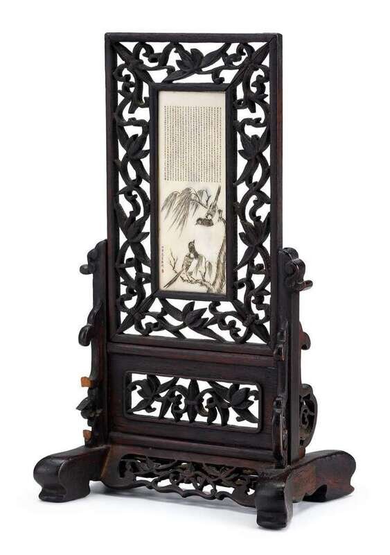 Tall rectangular panel insert with ivory plaque with female beauties and detailed script in reverse, bracket stand.