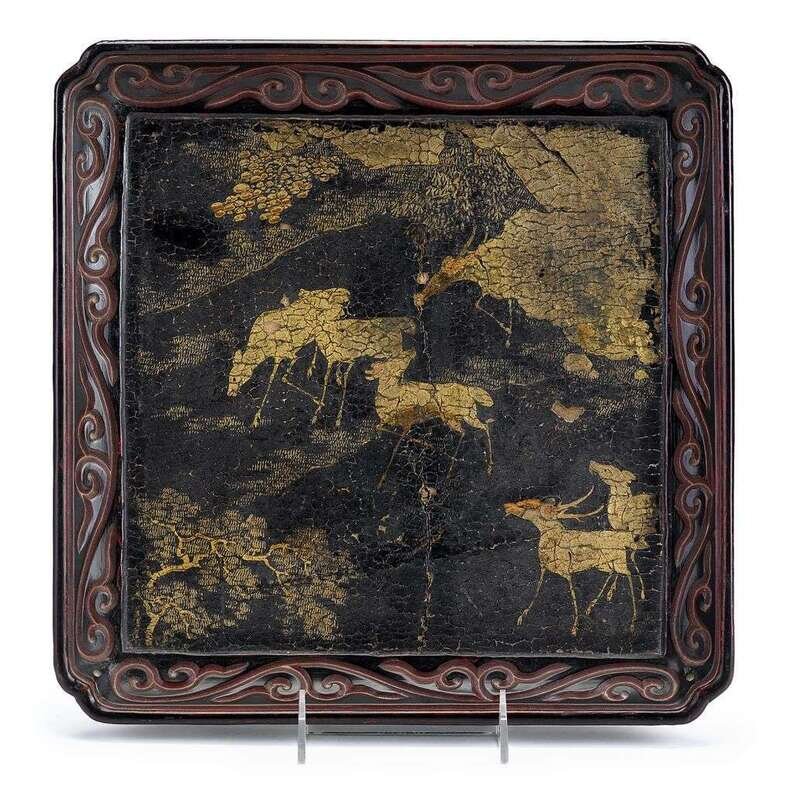 Of square form, carved shaped tixi panels frame a gilt and black lacquered panel depicting deer and pine grove, visible cheesecloth to base.