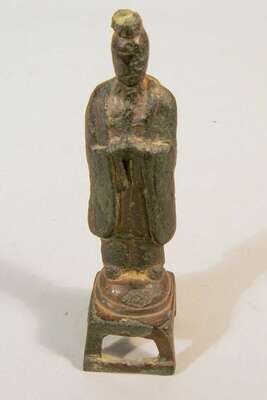 Depicting a standing male figure in long robes holding a hu tablet; with flattened, recessed back and standing on square base with trestle at front and two straight legs behind.