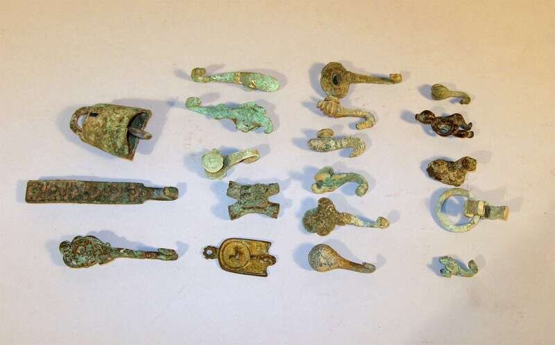Comprising 13 small bronze belt hooks, one functioning bell, a ring handle, 3 small toggles and a model of a recumbent beast.