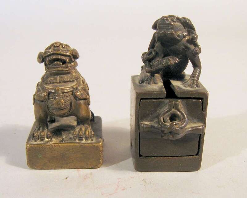 Single bronze seal in form of fu lion on square seal platform, no matrix; second seal of multi-use construction with engraved matrix to hollow seal that houses removable drawer to store wax that features two additional seal matrices on outside walls, surmounted by fu lion.