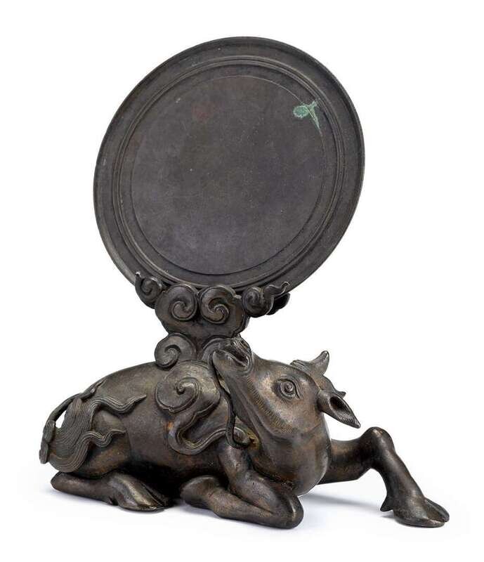 The well cast buffalo form beast is cast with celestial clouds supporting a plain mirror, minor gold flakes to base.