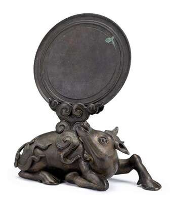 Rare and unusual Chinese gold-flake bronze mirror stand, and associated mirror ming dynasty