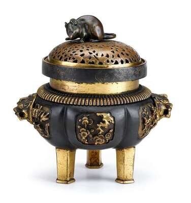 Good Chinese Ming gilt and patinated bronze tripod censer 16/17th century