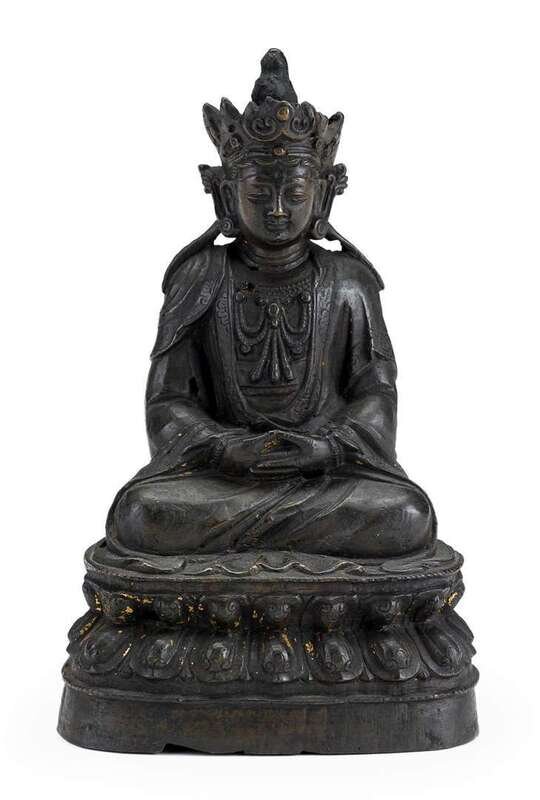 Single casting, dark brown patina, signs of gilt , crowned seated figure over double lotus throne.