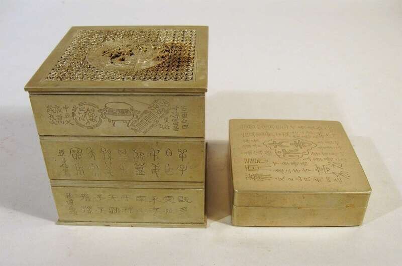 The largest of three tiers, pierced cover, script and 'antiques' to walls, together with a small square box.
